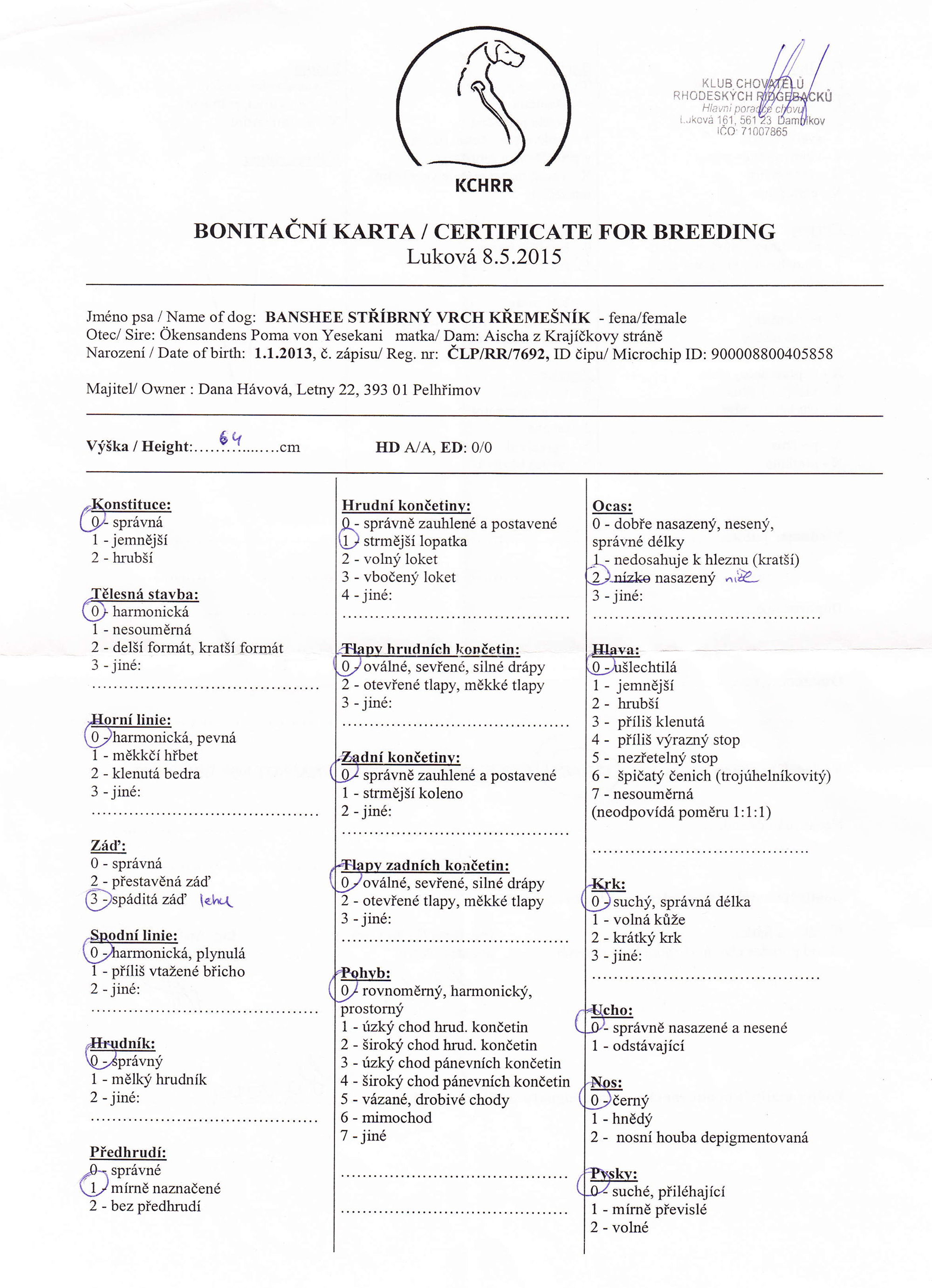 Dne 15. dubna 2015 byla Banshee uznána chovnou fenou.