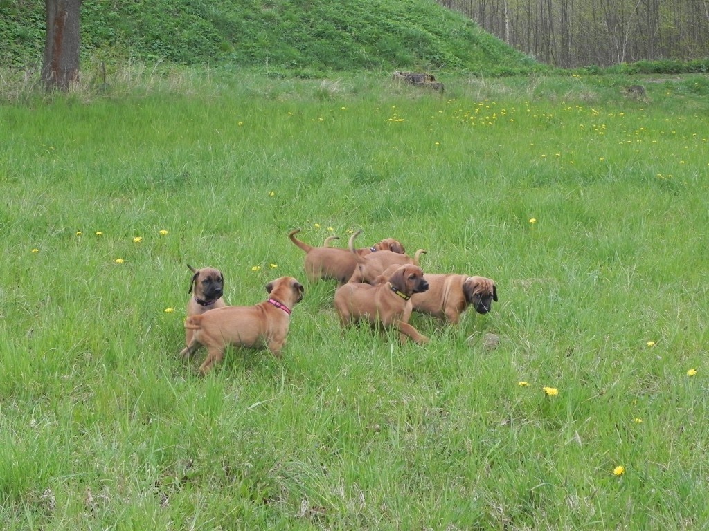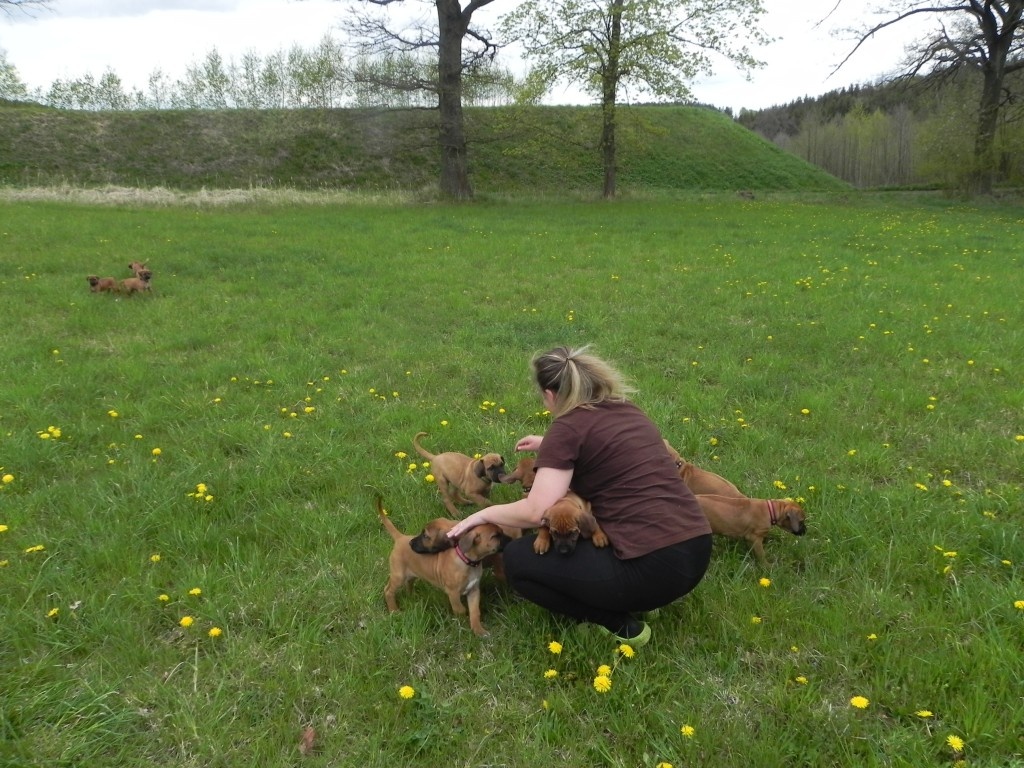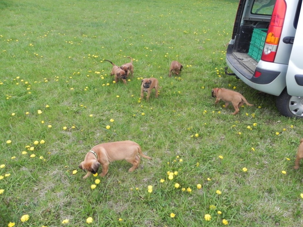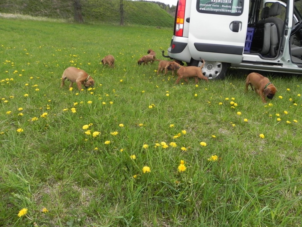 V rámci socializace jsme štěňátka naložili (ufff , lehká tedy rozhodně nejsou) a vyvezli jednou na louku, jednou k lesu. Pokaždé s delší projížďkou autem, nikdo nezvracel, nikdo nenaříkal..... vše proběhlo naprosto v pořádku. Po vypuštění do terénu jsme se nestačili divit, jak se miláčci rychle zorientovali a hodnění, škádlení, zkoumání nových věcí a také ochutnávání ledasčeho nebralo konce. Nechali jsme je tak kolem čtvrt hodiny řádit, pak - přece jen jsou ještě malí prckové - jsme náklad opět uložili do auta. Domů dojeli někteří již spící....