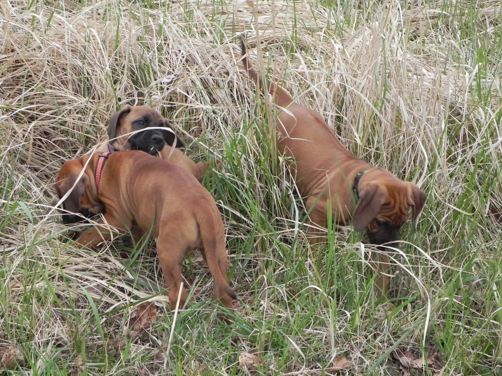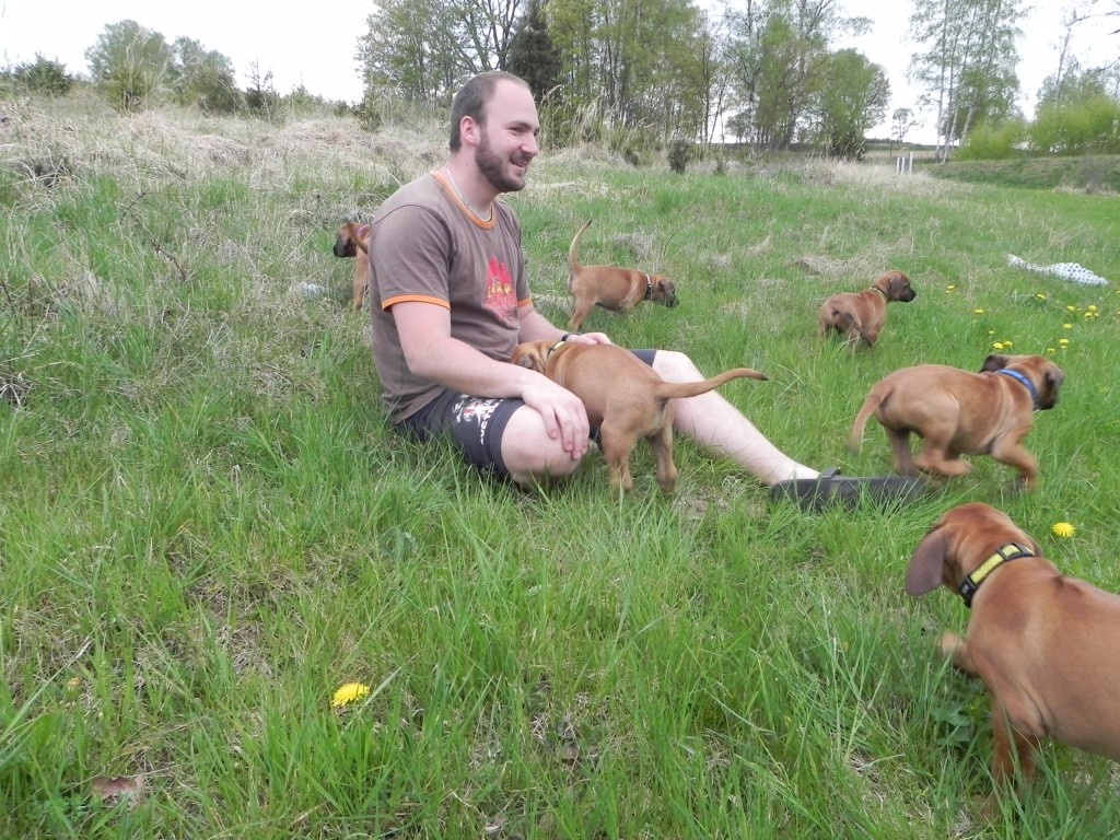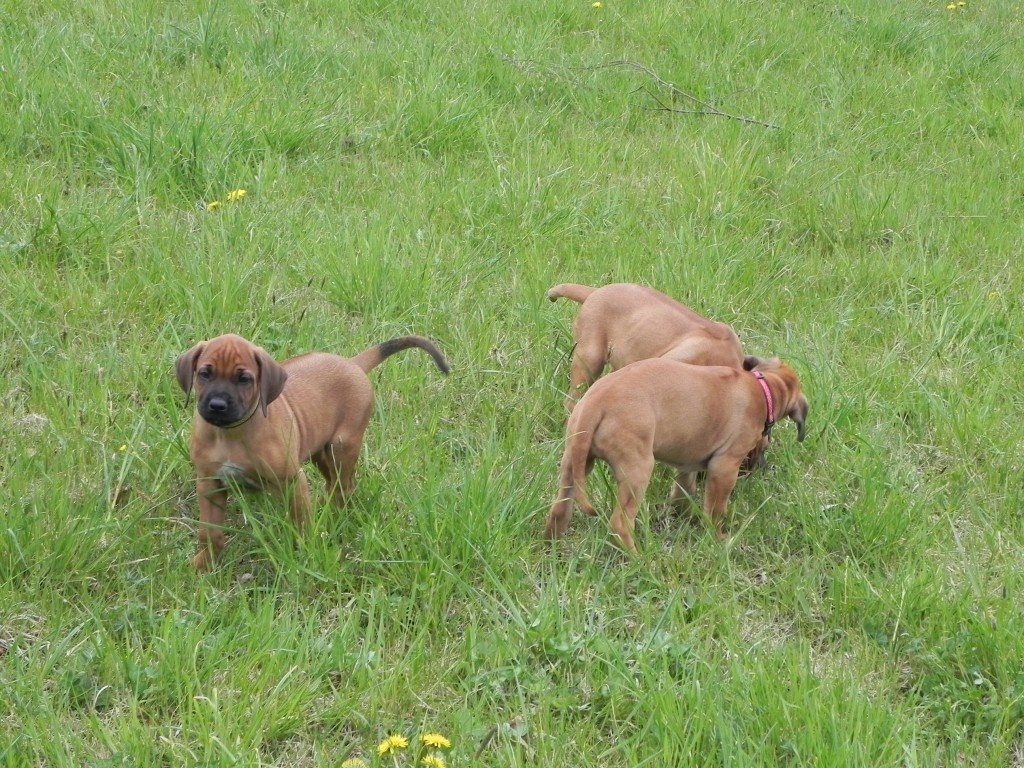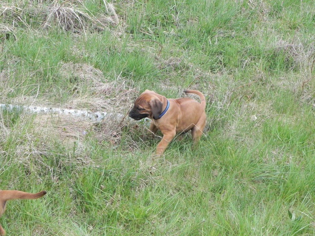 V rámci socializace jsme štěňátka naložili (ufff , lehká tedy rozhodně nejsou) a vyvezli jednou na louku, jednou k lesu. Pokaždé s delší projížďkou autem, nikdo nezvracel, nikdo nenaříkal..... vše proběhlo naprosto v pořádku. Po vypuštění do terénu jsme se nestačili divit, jak se miláčci rychle zorientovali a hodnění, škádlení, zkoumání nových věcí a také ochutnávání ledasčeho nebralo konce. Nechali jsme je tak kolem čtvrt hodiny řádit, pak - přece jen jsou ještě malí prckové - jsme náklad opět uložili do auta. Domů dojeli někteří již spící....
