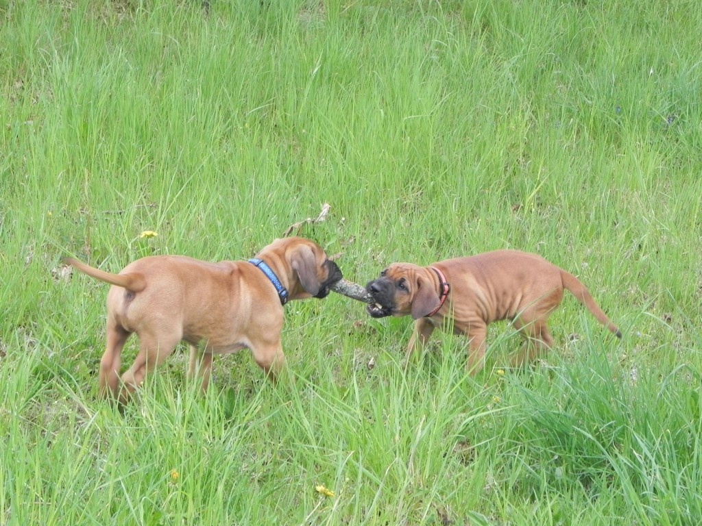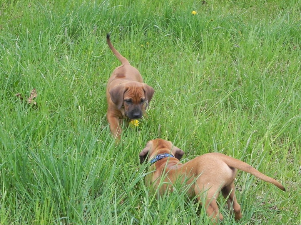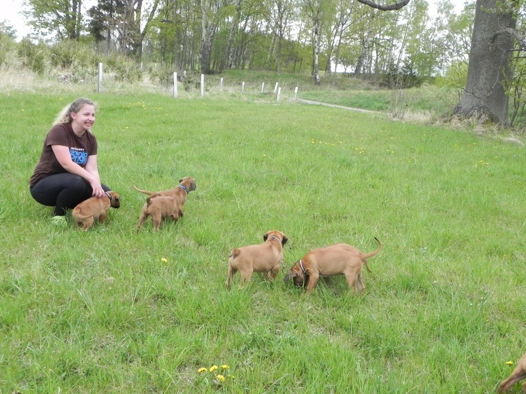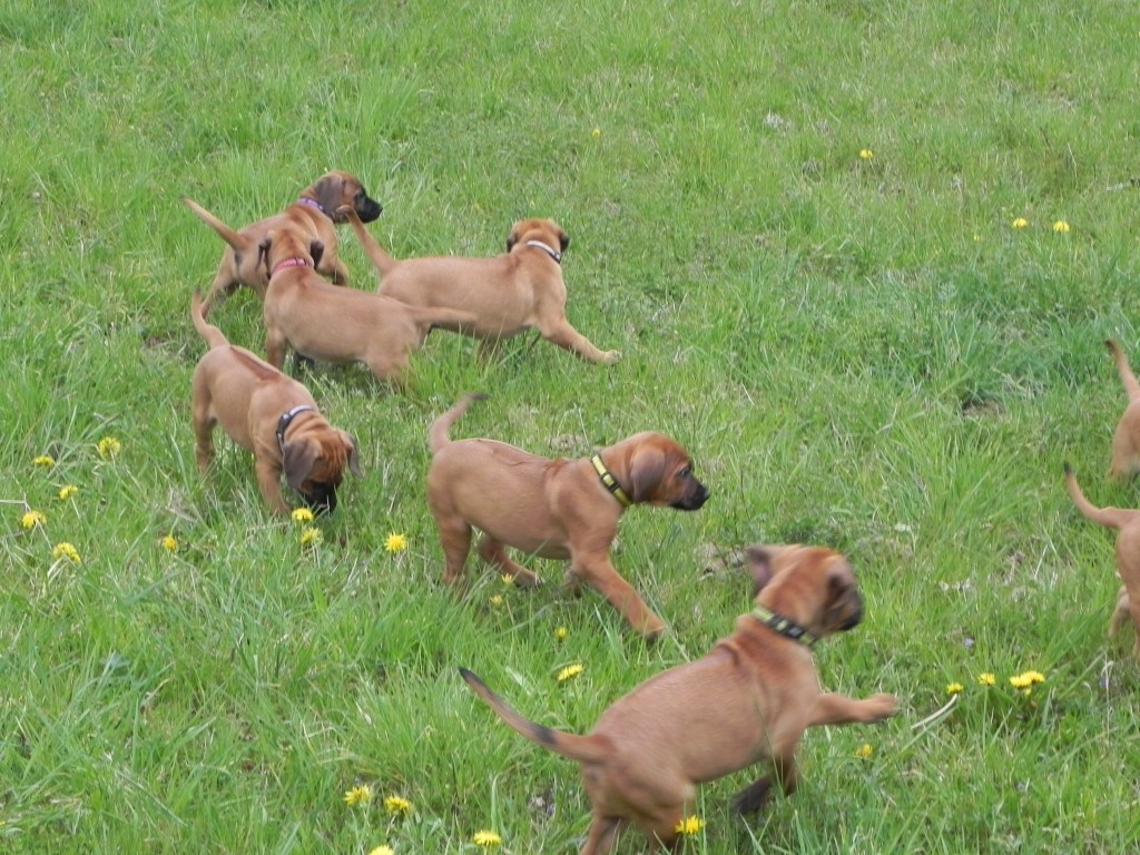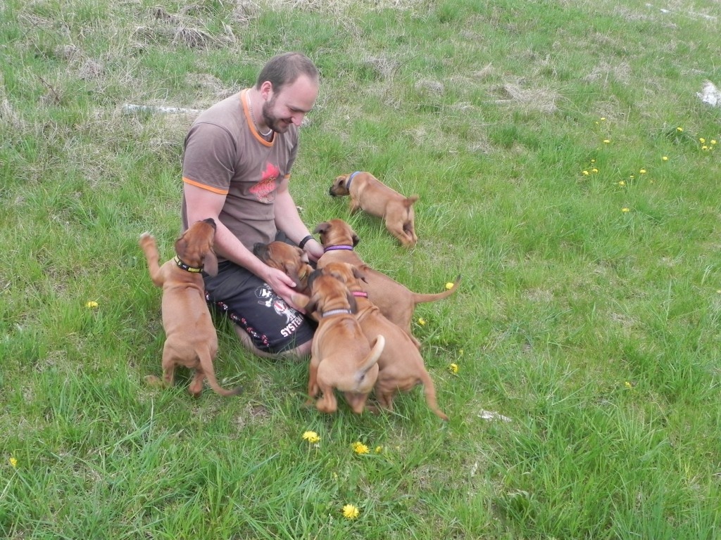 V posledních dnech vše strašně rychle utíká, štěňátka už nejsou štěňátka, ale malí ničitelé, koušou vše co se dá. Nejvíc je samozřejmě zajímá plůtek, který jsme postavili na zahradě kolem ovocných keřů. Každou chvilku některý z nich zkoumá, jak se za plot dostat. Jsou šikulové. Není chvilky, abych některého za plotem nelovila... Počasí nám zatím přeje, denně jsou venku hezkých pár hodin. Pak ale také padnou a spinkají jako nemluvňátka. Bude mi po nich určitě moc smutno.