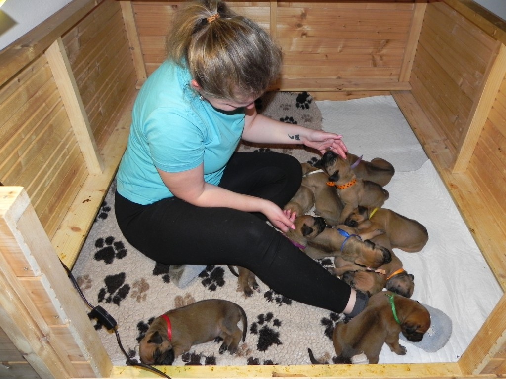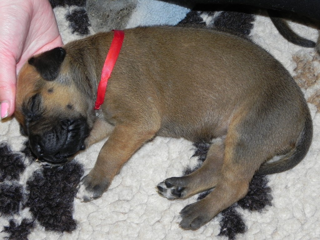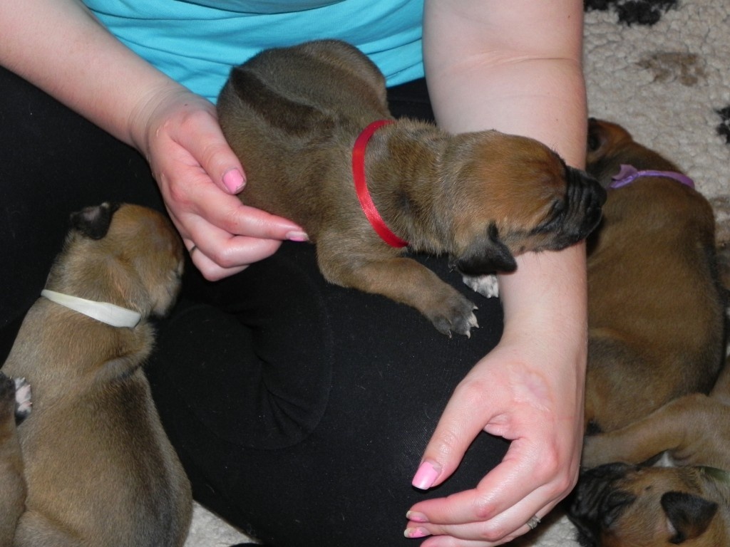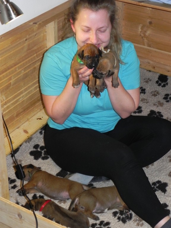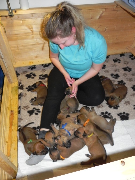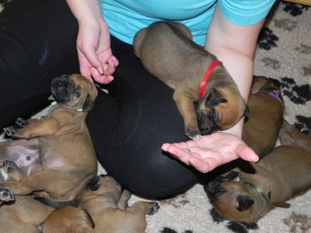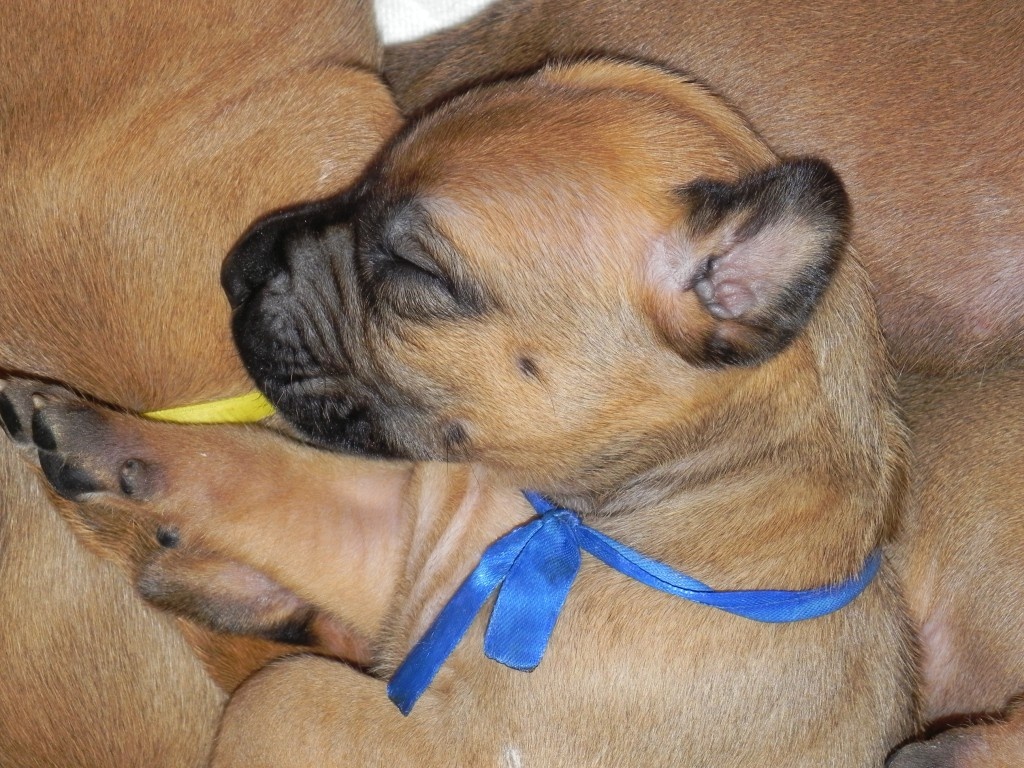 Porodní váhy štěňat jsou vysoké, modrý kluk pokořil hranici 1500 g, ostatní ho zdatně dohánějí. Brzy však dojde na přikromování, takovou hordu máma nemůže dlouho zvládnout sama.Počítám příští týden. A koncem pak budeme míchat na první kašičky. Utíká to, utíká.