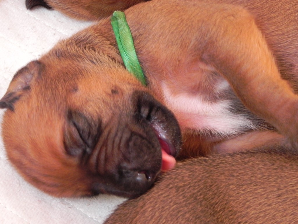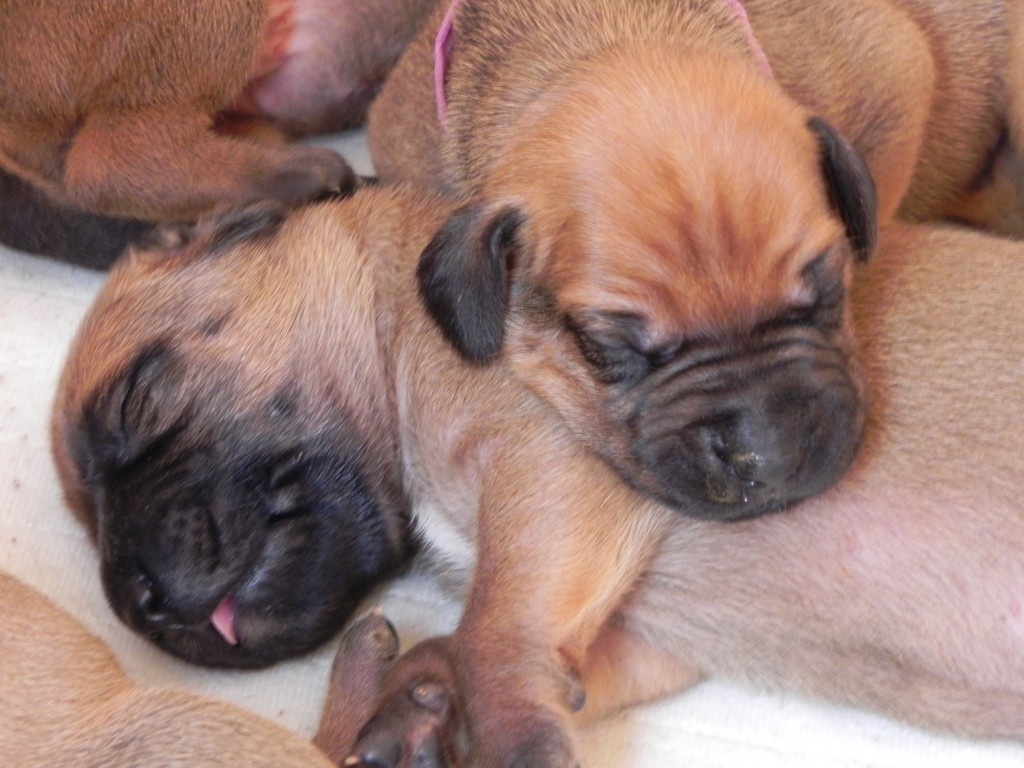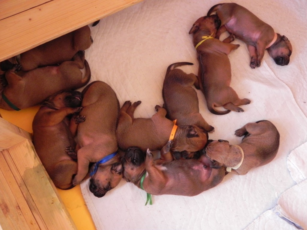 Štěňátka na Křemešníku krásně prospívají, všichni kluci už mají víc jak kilo váhy, holčičky je zdatně dohání. Máma Banshee vydatně kojí, každé tři hodiny ve dne v noci se hrne k porodnici. Nejdříve očista, pak zalehává. A mlíčko teče proudem :) . Dnes také první uličníček otevřel jedno očičko, desátý den je opravdu brzo, vždy až tak třináctý den. Holt se už chtěl podívat na svět okolo. Stříhání drápků máme za sebou, do konce týdne proběhne první odčervení. Pak už nedočkavě budeme čekat na kontrolorku vrhu.