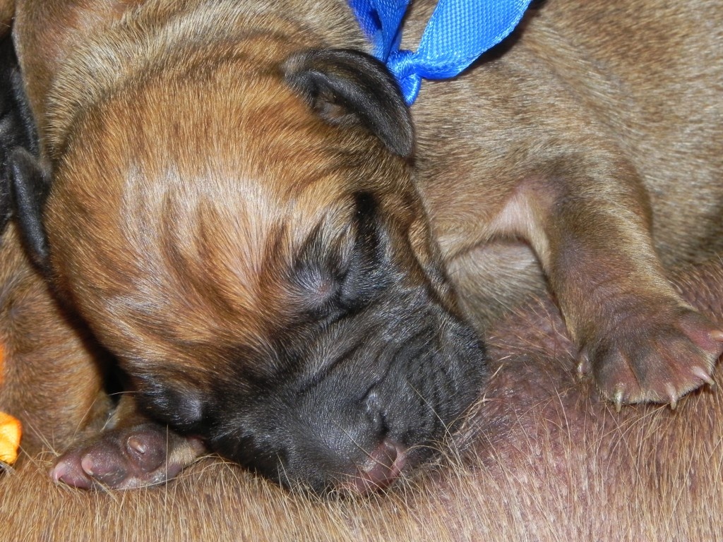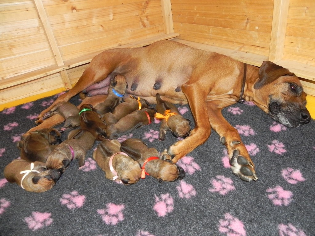 Dlouhý a náročný víkend jsme měli.... Banshee nakonec porodila 12 krásných štěňátek, sedm pejsků a pět feneček. Dali jí ale fest zabrat, protože každé z nich mělo váhu více jak 520 g, největší macek dokonce 590 g. Opravdu obrovská štěňátka. Máme tři štěňata bez ridge (pejsek a dvě fenky) a jednu fenku se třemi korunkami na ridge. Jinak je vrh prozatím standartní, bez DS, bez zálomků, pár štěňátek má náprsenku, některá ale třeba vůbec. Máma vydatně kojí, má s takovou hordou hodně práce. Je ale trpělivá a obětavá, takže štěňátka většinou napitá mlíčkem až nadoraz spinkají rozesetá po porodní bedně.