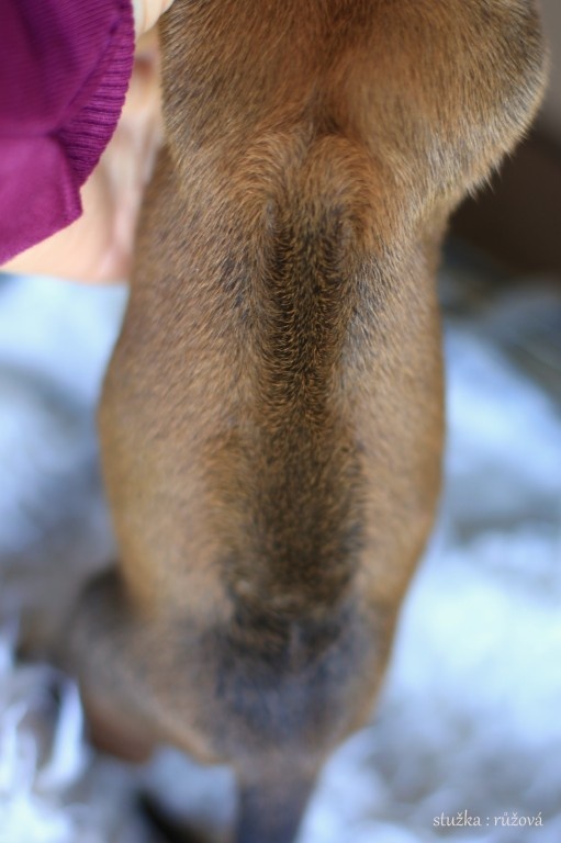 V pořadí šestá se narodila fenka, porodní váha 540 gramů, označena růžovou stužkou, prozatím jako jediná z vrhu nestandartní - více korunek na ridge.
