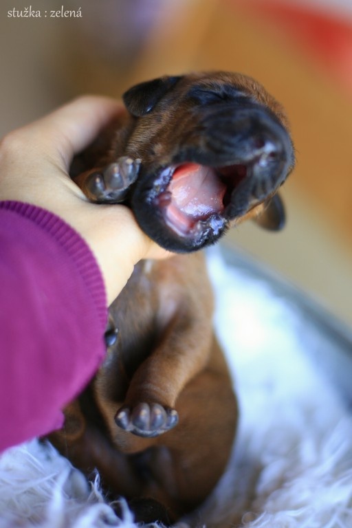 První pejsek narozen 30. září ve 3.05, porodní váha 585 gramů, označen zelenou stužkou
