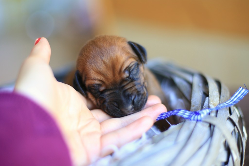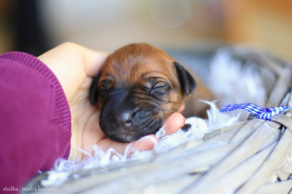 Druhý v pořadí opět pejsek, porodní váha 565 gramů, označen stužkou modré káro