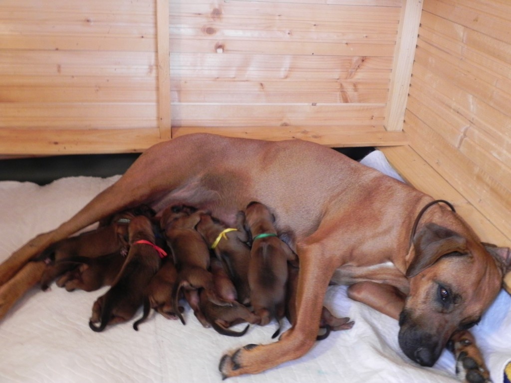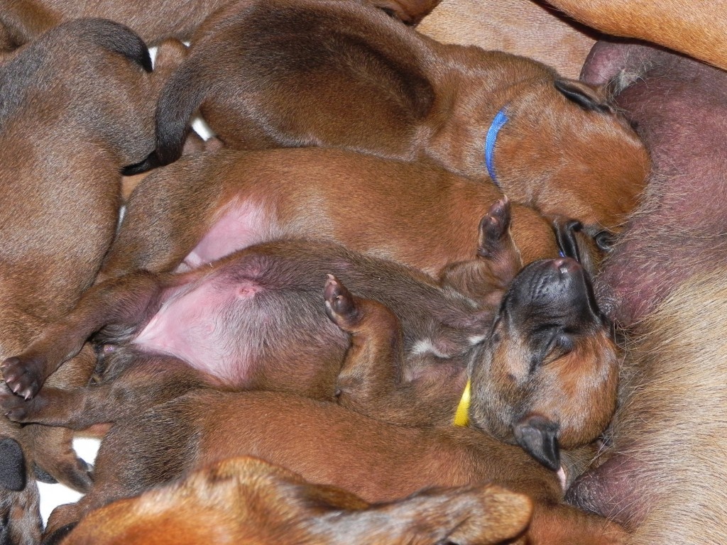 Křemešničtí salámci se mají k světu. Nějaký "poporodní úbytek váhy" se u nás nenosí, největší chlapeček (zelený) se včera chlubil osmdesátigramovým přírůstkem!! Ostatní se drželi v těsném závěsu... Mamka Banshee vydatně kojí a ošetřuje, vyvenčit se chodí až s mírnou hysterií, že jí miminka mezitím zmizí. Ledva dosedne na travičku, už má v očích hrůzu a zpátky spěchá tak, že nestačím otevírat dveře. Je vzorná.