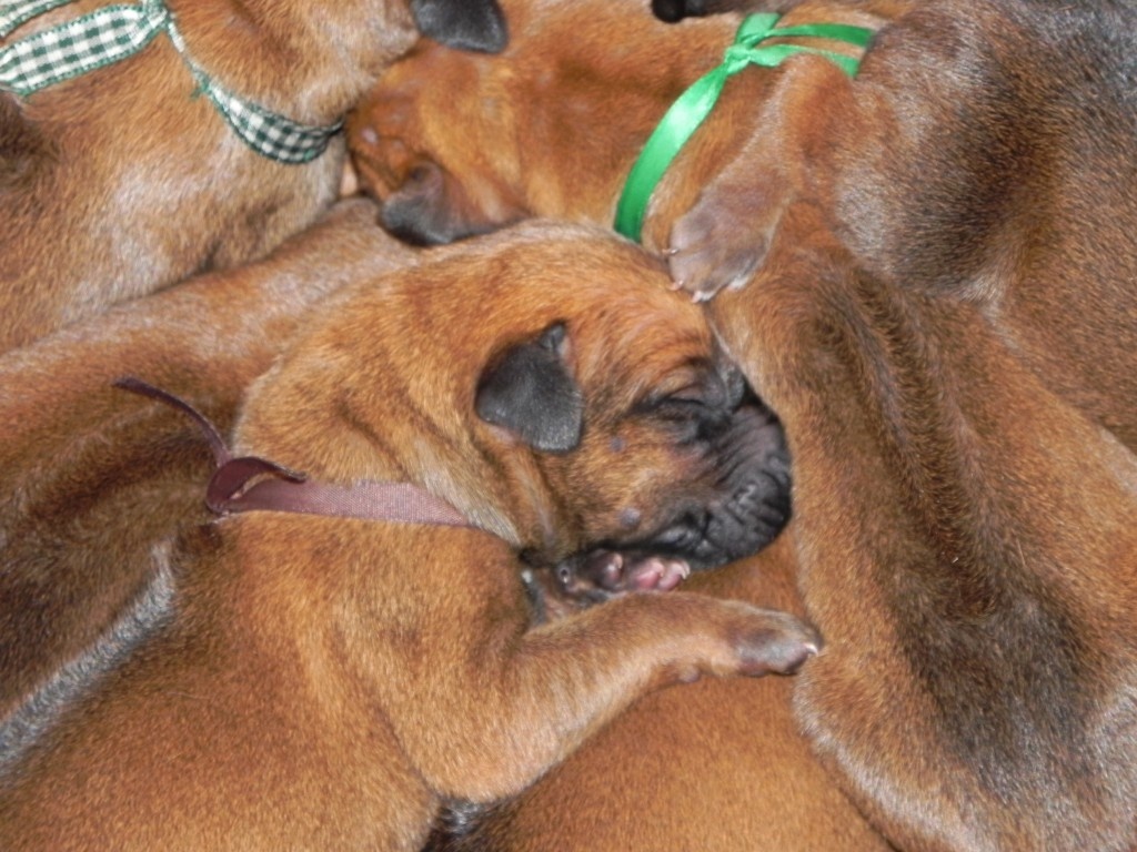 Ve čtvrtek mi profesionální fotografka a zároveň matka krycího psa Kubího nafotí jednotlivé portréty, které dáme sem na web. Aby si budoucí páníčci mohli udělat obrázek o vrhu. Co se mi osobně nejvíce líbí, jsou krásné černé masky - přesně tak, jak jsem si představovala. Brzy bude na fb spousta fotek s malými bubáčky :) Po druhé kontrole vrhu, která štěňata definitivně rozdělí na standart a nestandart (ve hře jsou ještě zuby, kvůli podkusu nebo předkusu či špatnému skusu se může štěně přeřadit ze standartu do nestandartu) si vyberu fenečku pro sebe a pak se rozdělí ostatní, pejsci i fenečky. Zadána jsou všechna štěňátka.