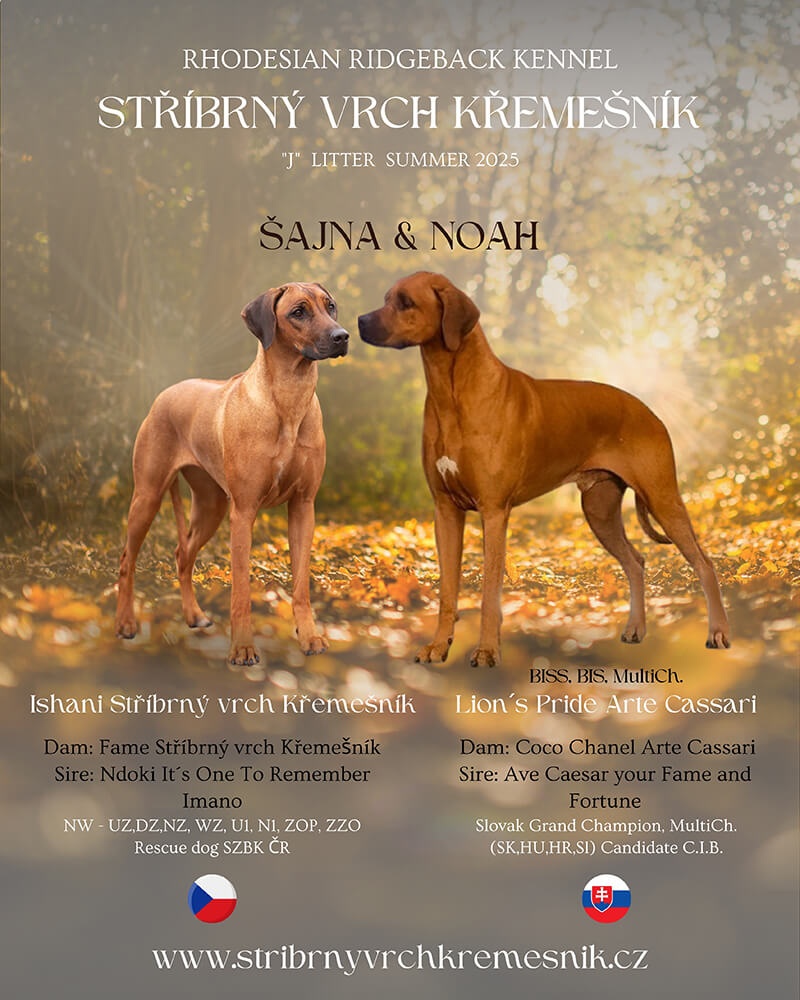 Pro letošní plánovaný vrh jsme vybrali krásného krycího psa ze Slovenska. Noah je pes se správnou konstitucí, harmonickou stavbou těla, rovnoměrným, ladným a prostorným pohybem s velmi pěknou dynamikou. Jeho barva je červená pšenice s malou bílou skvrnou na hrudi. Má ušlechtilou hlavu s černou maskou a celkově je to typický představitel plemene s výbornými proporcemi.